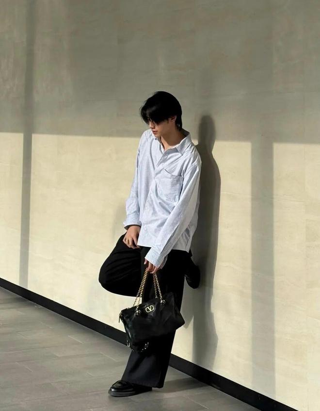 这身则是在包包上做了文章,往往在穿基础款的时候,更要额外在配饰上做加法。他在鞋子上还蛮有自己的看法的,选了一双看上去没那么单调的鞋子,很能增加全身的看点。