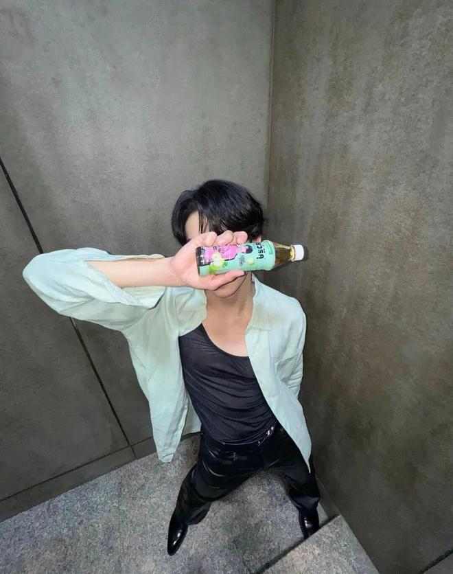 衬衫敞开来穿,也是很时髦的一个穿法。他更为特别的地方是,还选了一件薄荷绿的衬衫,披在all black内搭外面,完全就是穿搭高手的样子了。