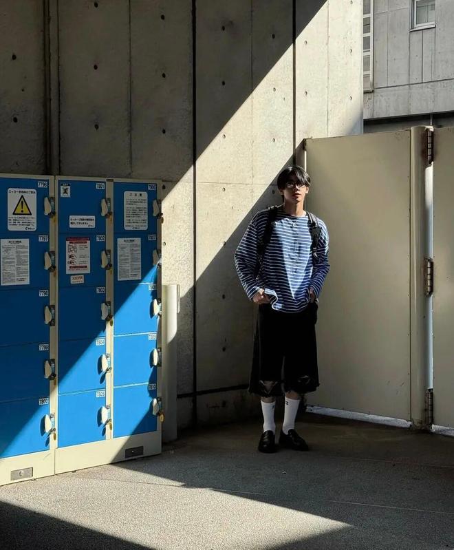 蓝色条纹衫容易一不小心就穿得很无聊,就可以像他这样穿一条破洞牛仔中裤,很有时髦感,而且走在人群中也是能让大家眼前一亮的存在。